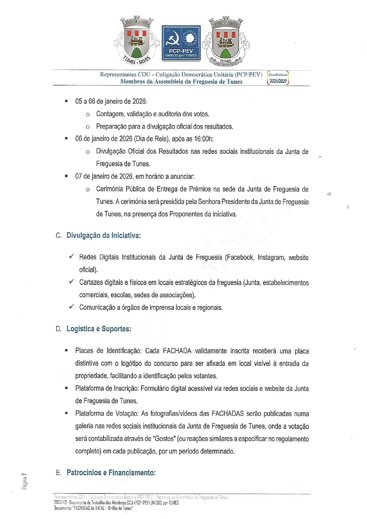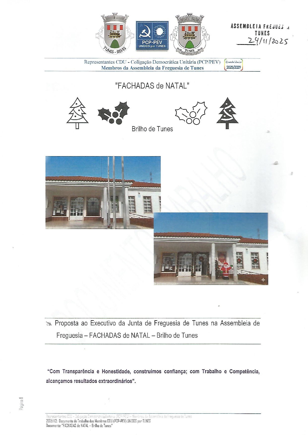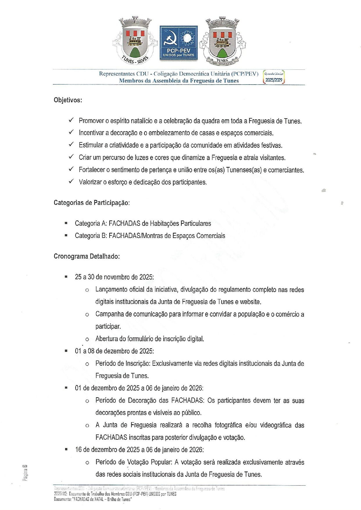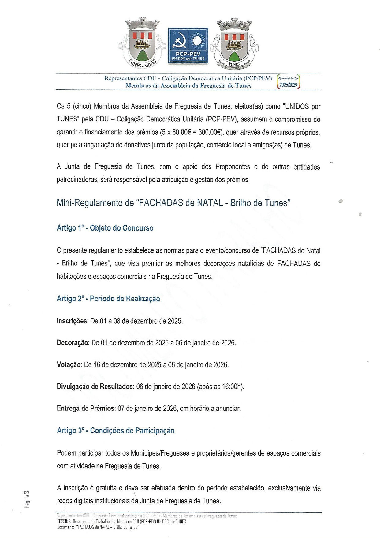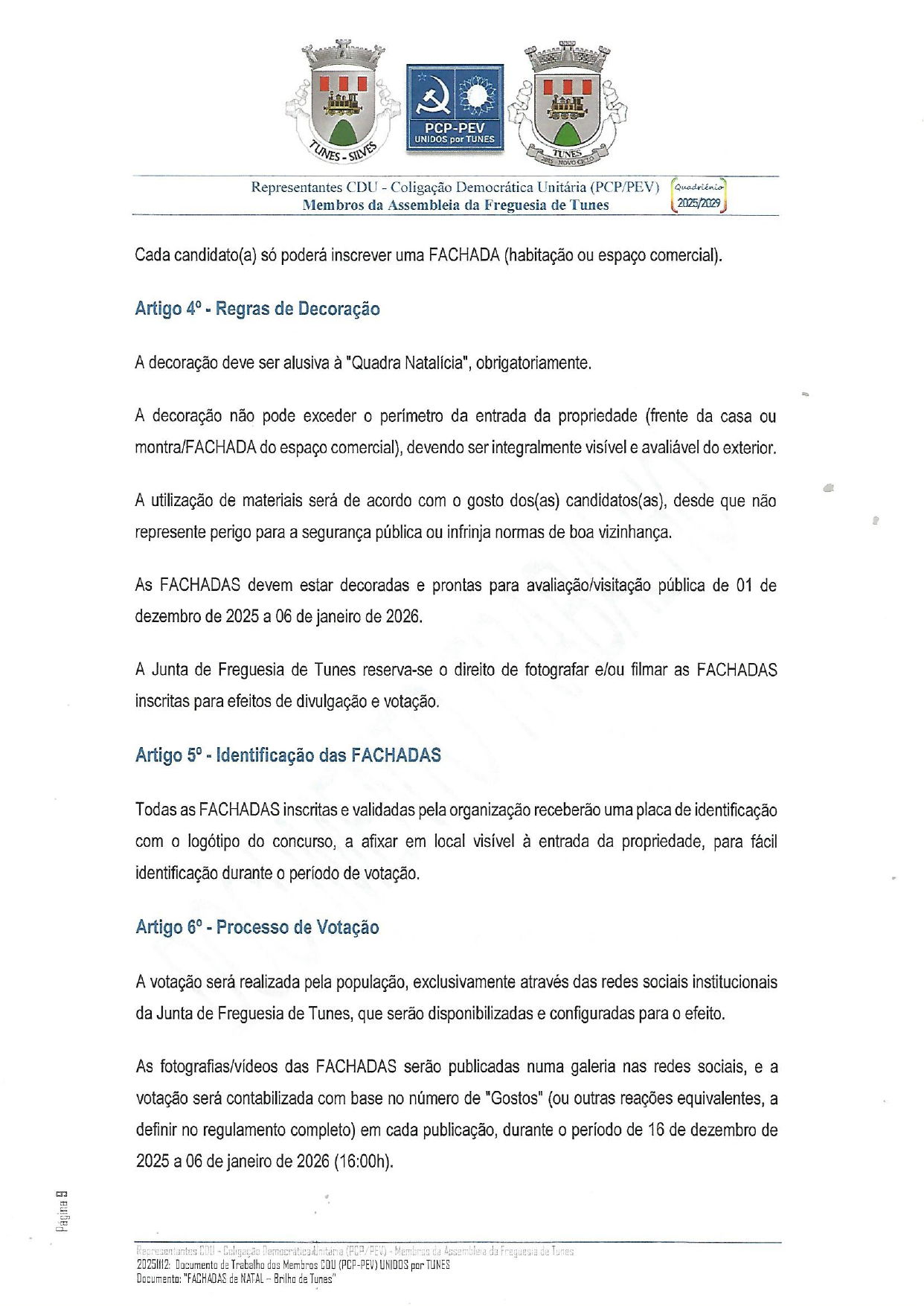 “FACHADAS de NATAL – Brilho de Tunes”, e que consiste no essencial – Decoração da FACHADA da casa e/ou montra de espaço comercial, de 01 de dezembro de 2025 a 06 de janeiro de 2026 (Dia de Reis), do perímetro da Freguesia.