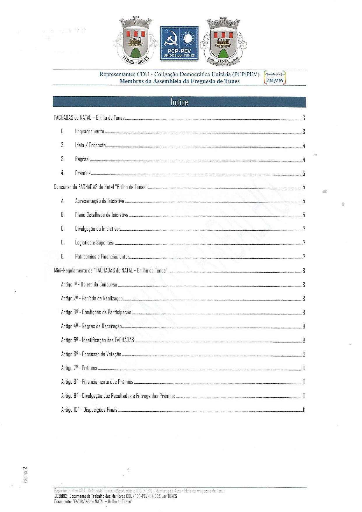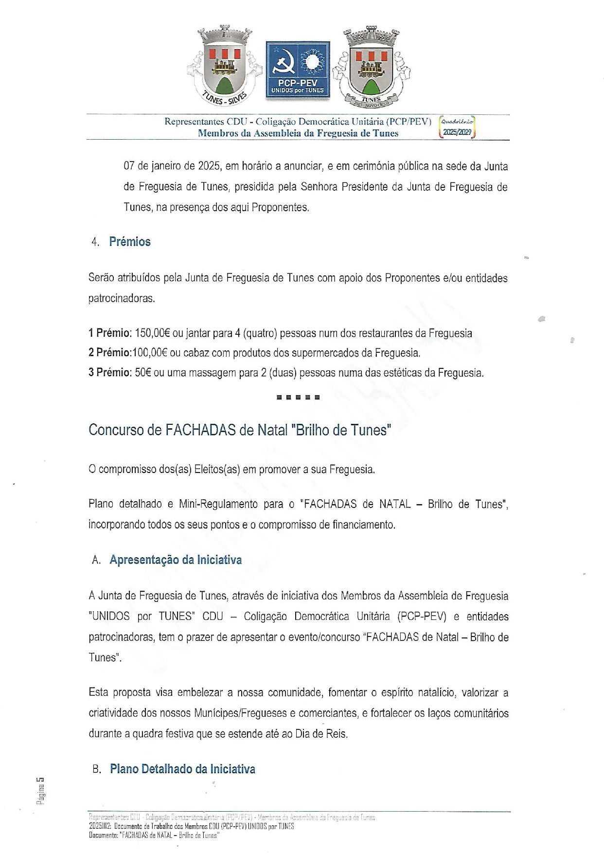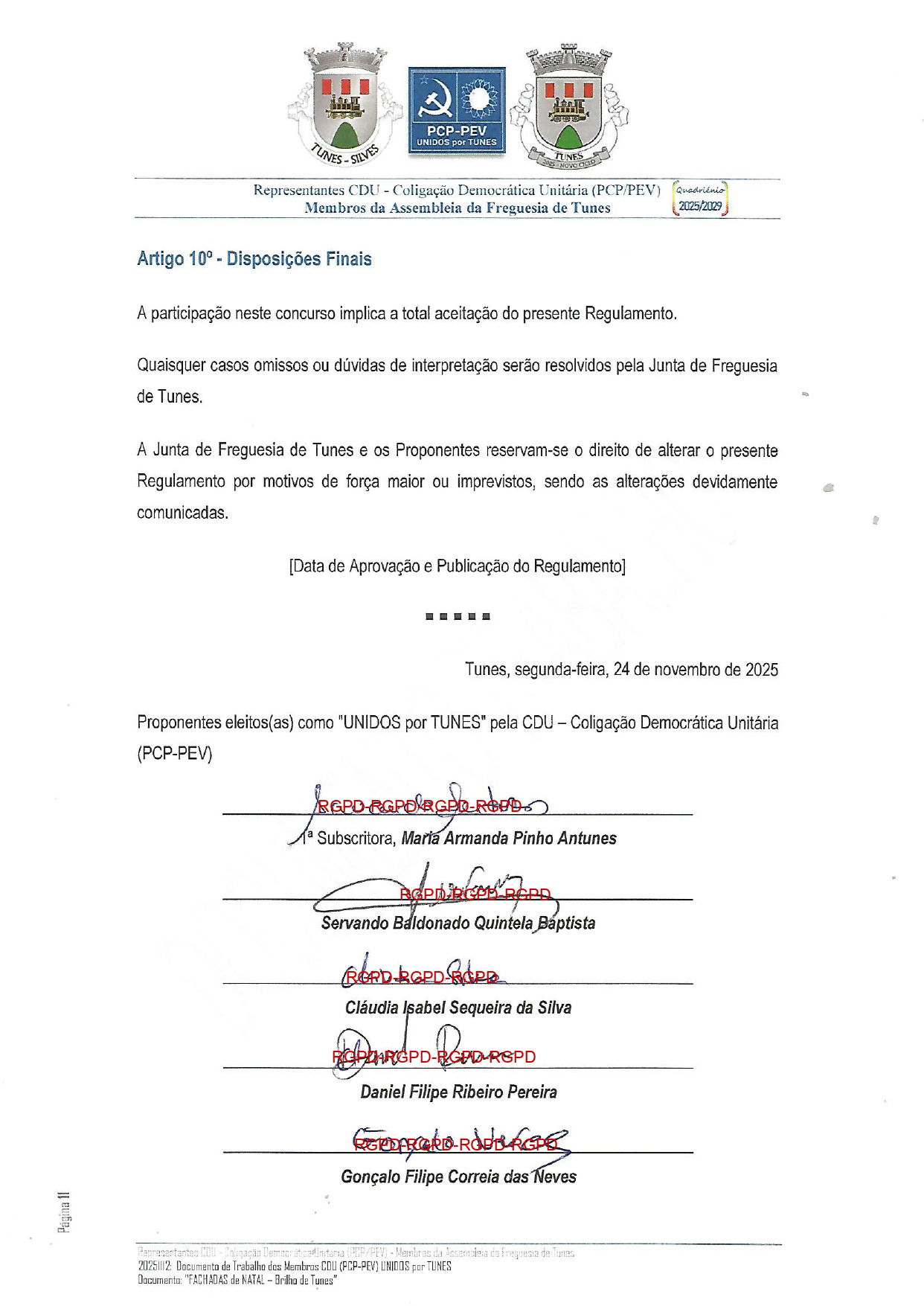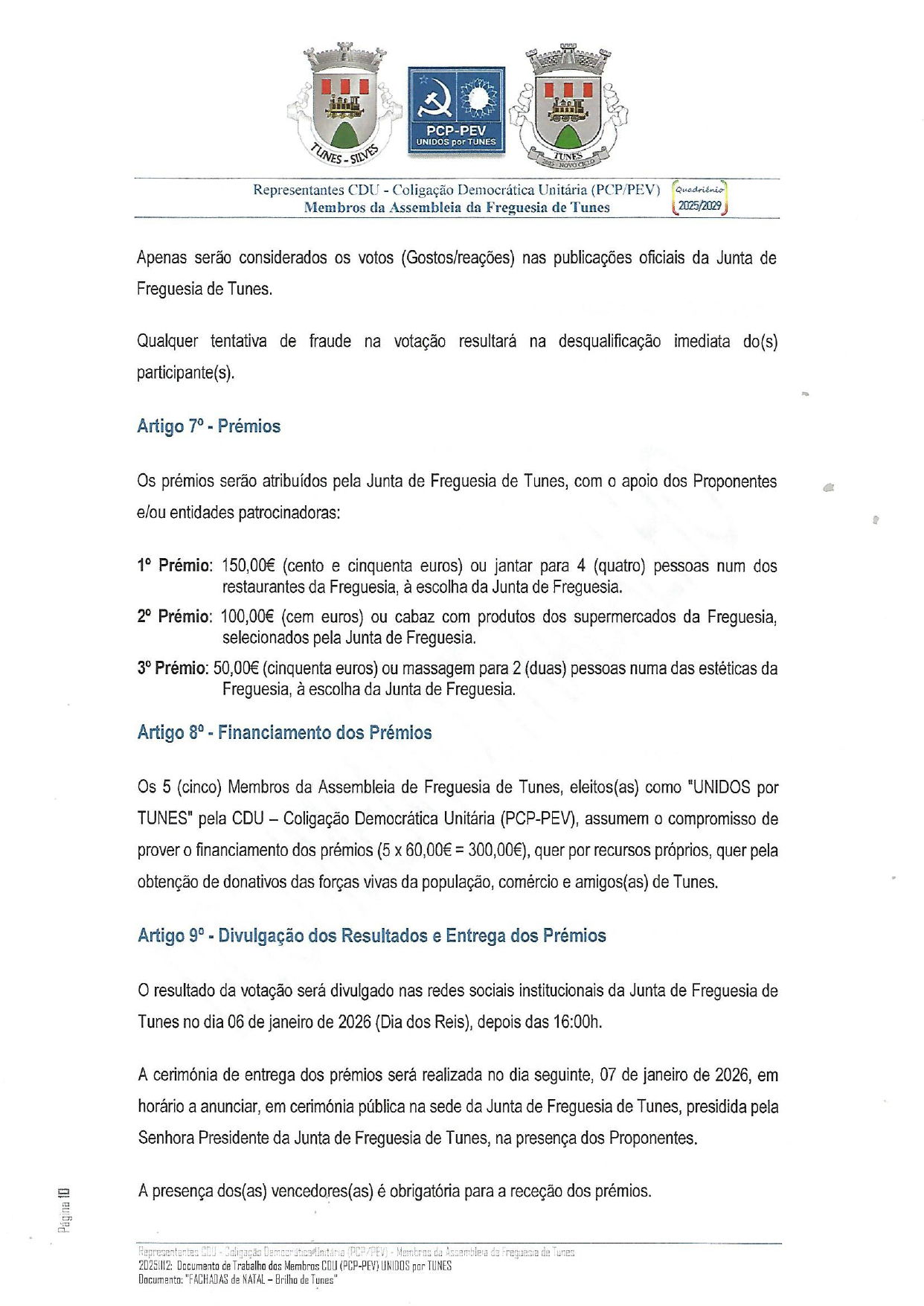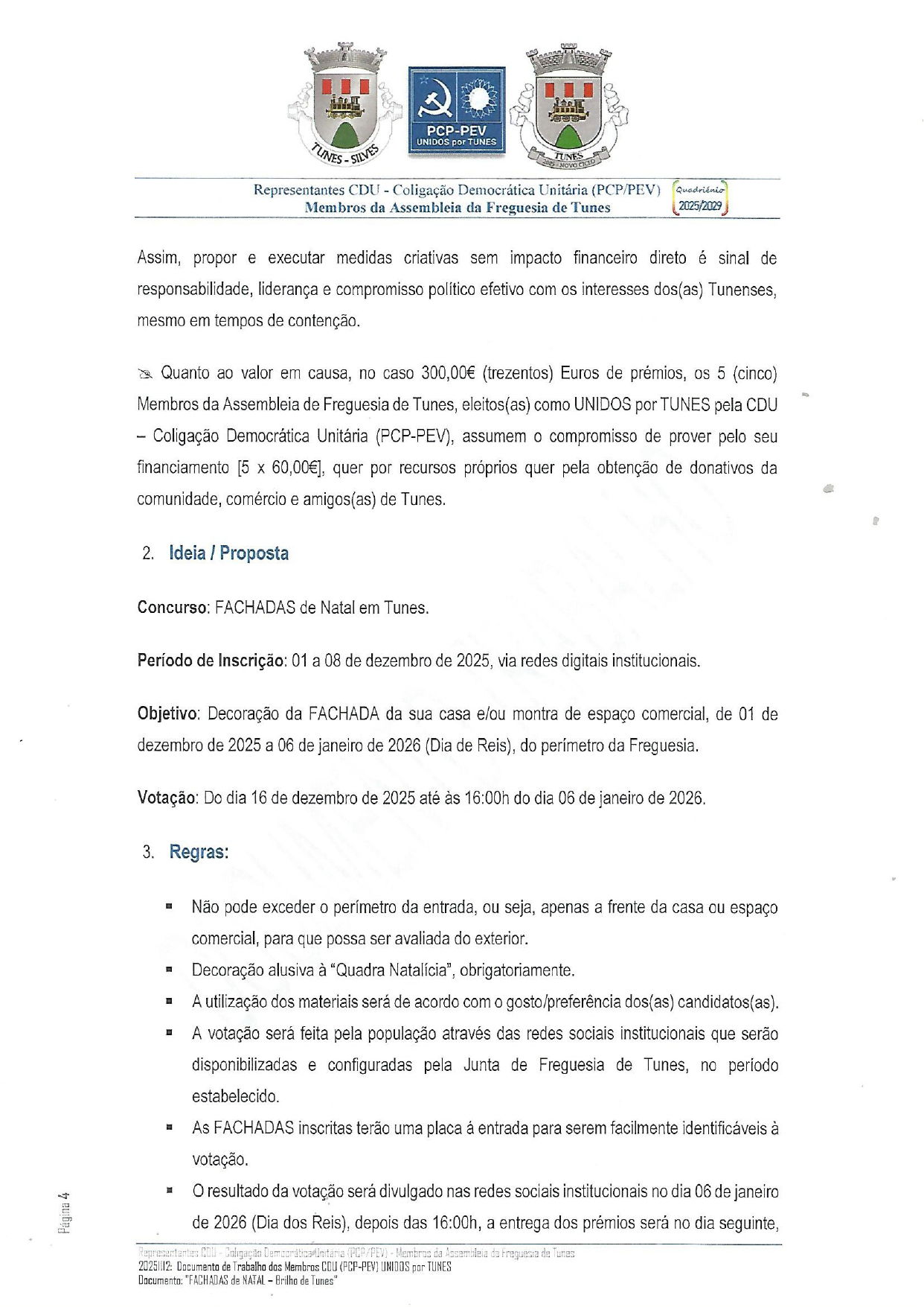 “FACHADAS de NATAL – Brilho de Tunes”, e que consiste no essencial – Decoração da FACHADA da casa e/ou montra de espaço comercial, de 01 de dezembro de 2025 a 06 de janeiro de 2026 (Dia de Reis), do perímetro da Freguesia.