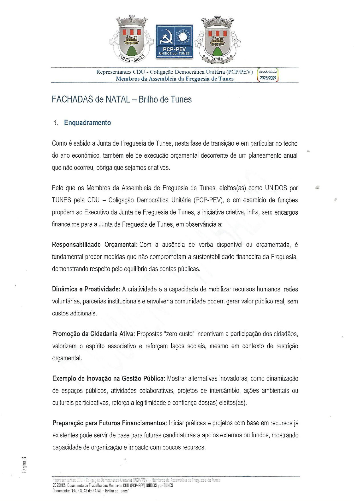 PROPOSTA/SUGESTÃO/DOCUMENTO DE TRABALHO – Apresentados na Sessão Extraordinária da Assembleia de Freguesia de 24/11/2025 pelos Membros da Bancada CDU – Coligação Democrática (PCP-PEV)