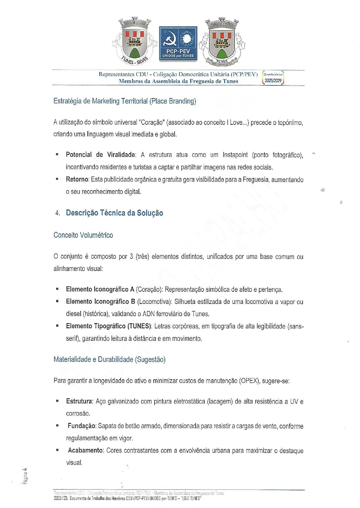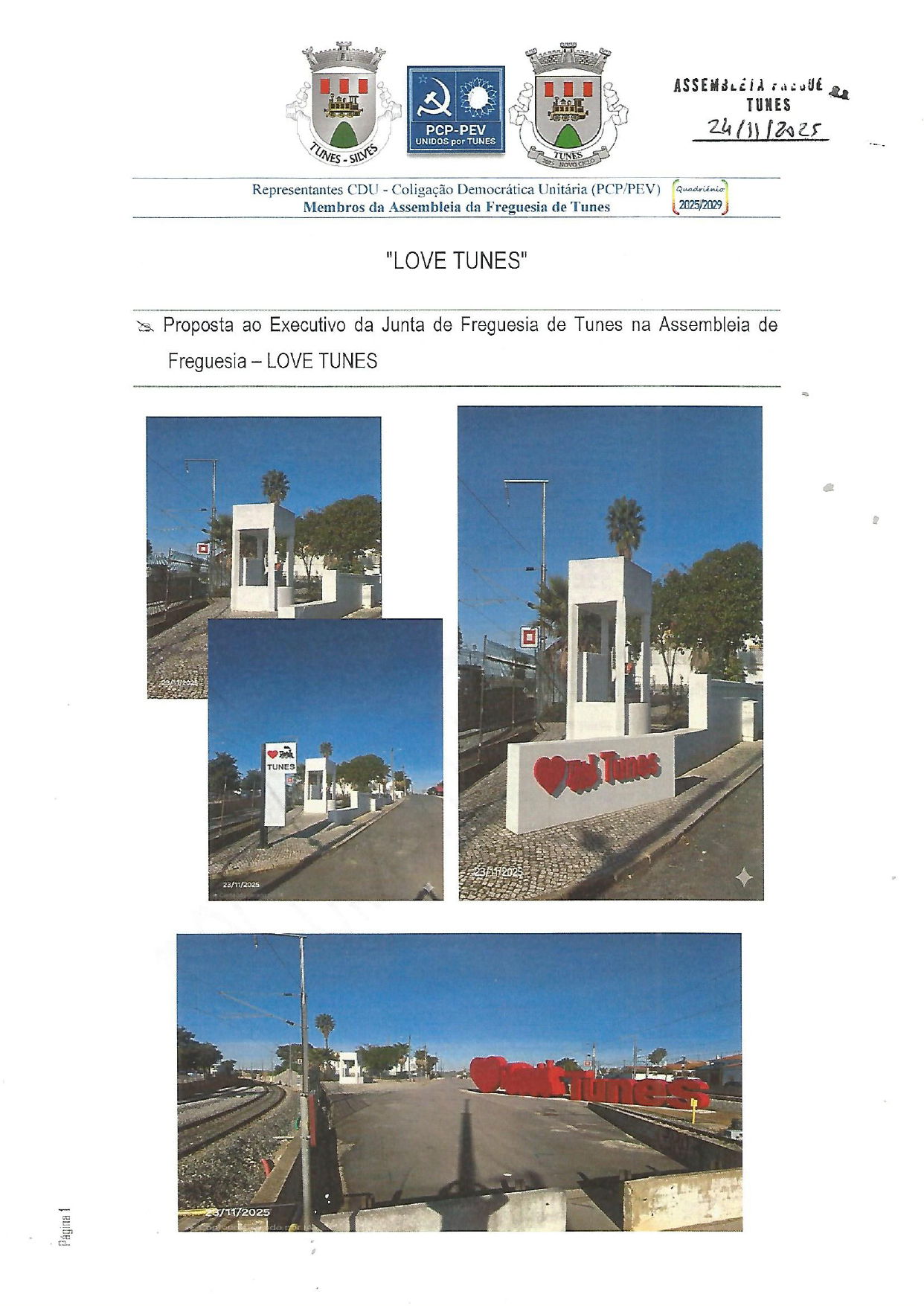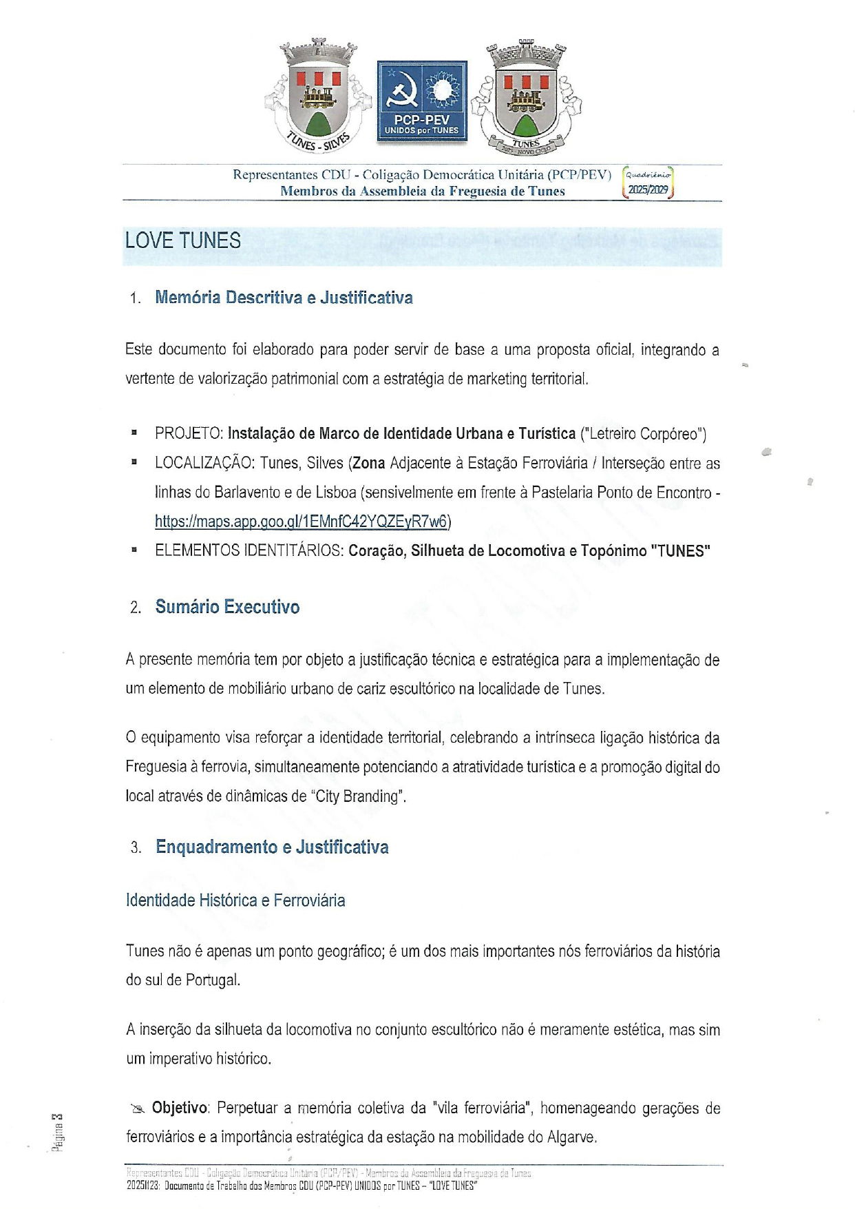 “LOVE TUNES”, que consiste no essencial – Instalação de Marco de Identidade Urbana e Turística ("Letreiro Corpóreo"), na Zona Adjacente à Estação Ferroviária / Interseção entre as linhas do Barlavento e de Lisboa (sensivelmente em frente à Pastelaria Ponto de Encontro - https://maps.app.goo.gl/1EMnfC42YQZEyR7w6), Coração, Silhueta de Locomotiva e Topónimo "TUNES".